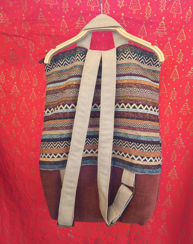Mochila artesanal elaborada cuidadosamente a mano, con un tejido de rayas étnicas que combina motivos geométricos y una rica paleta de colores tierra, azulados y mostaza. Un diseño equilibrado y con profundidad visual, pensado para quienes buscan un complemento con identidad propia.