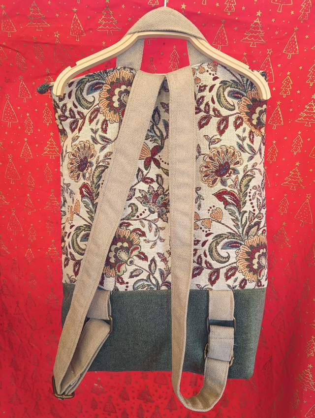 Su diseño destaca por el patrón superior inspirado en el Art Déco, presentando un elegante motivo de hojas o plumas en color beige pálido sobre un fondo topo claro. Este tejido con textura aporta un toque distintivo y sofisticado. La base de la mochila está confeccionada con un resistente tejido liso de trama fina en un tono gris jaspeado, creando un hermoso contraste visual y asegurando durabilidad.